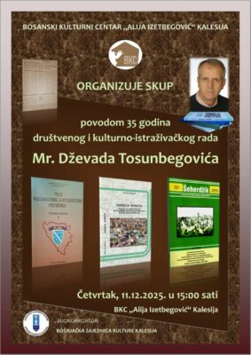 JU BKC “Alija Izetbegović” organizira skup povodom 35 godina društvenog i kulturno – istraživačkog rada mr. Dževada Tosunbegovića. Skup će biti održan u galeriji BKC-a u četvrtak, 11.12. 2025. godine sa početkom u 15;00 sati. Učesnici skupa su: prof. emeritus Salih Kulenović, prof. dr. Sead Selimović, prof. dr. Sead Omerbegović, prof. dr. Izet Hadžić, mr. […]