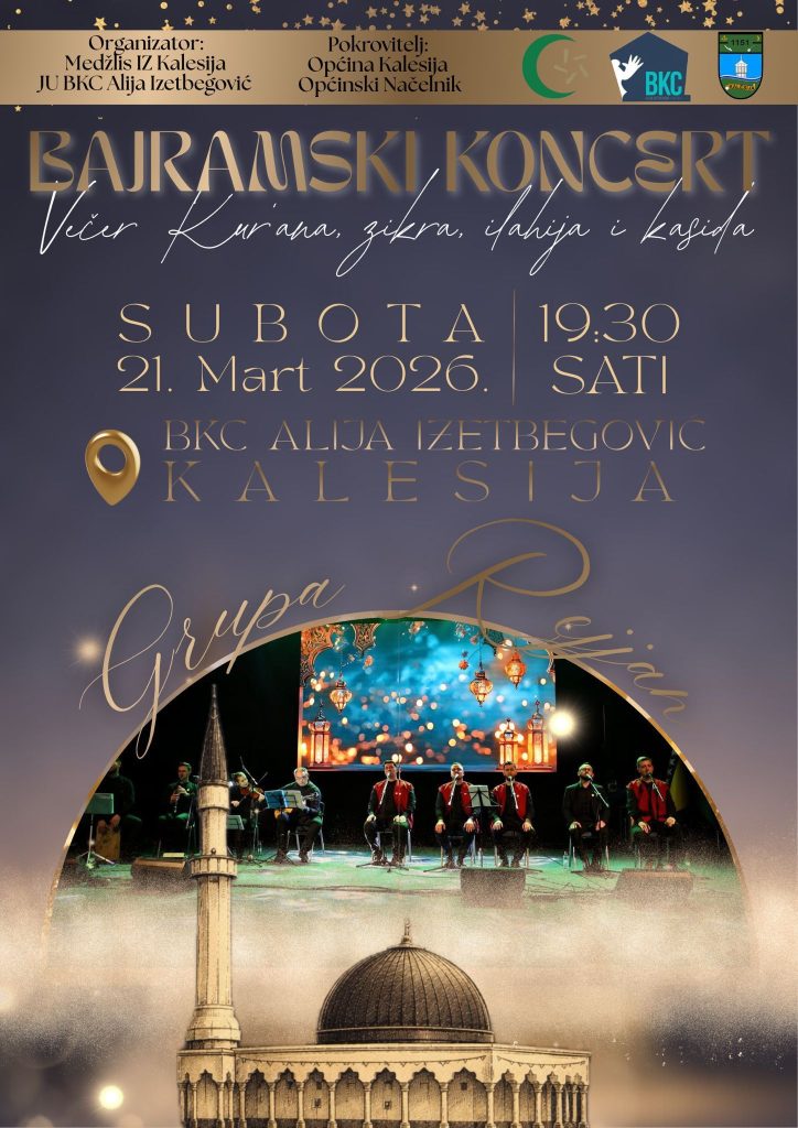 Bajramski koncert biti će upriličen drugi dan Bajrama, odnosno 21.3.2026. godine, sa početkom u 19:30 sati. Nastupa Grupa Rejjan.
