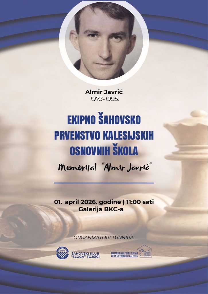 U organizaciji Šahovskog kluba “Sloga” Tojšići i JU BKC “Alija Izetbegović” Kalesija, bit će organizovano ekipno šahovsko prvenstvo kalesijskih osnovnih škola, pod nazivom Memorijal “Almir Javrić”.